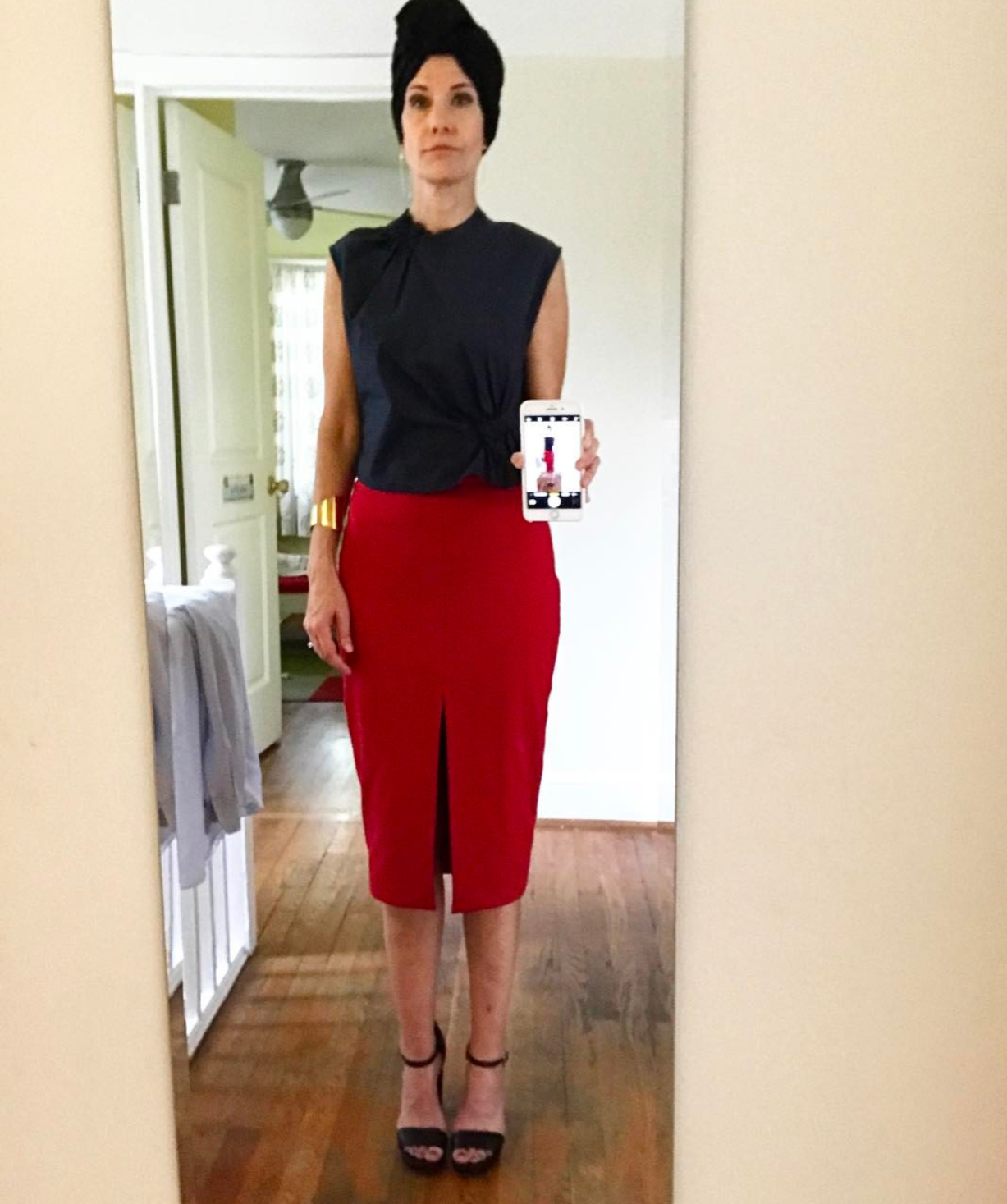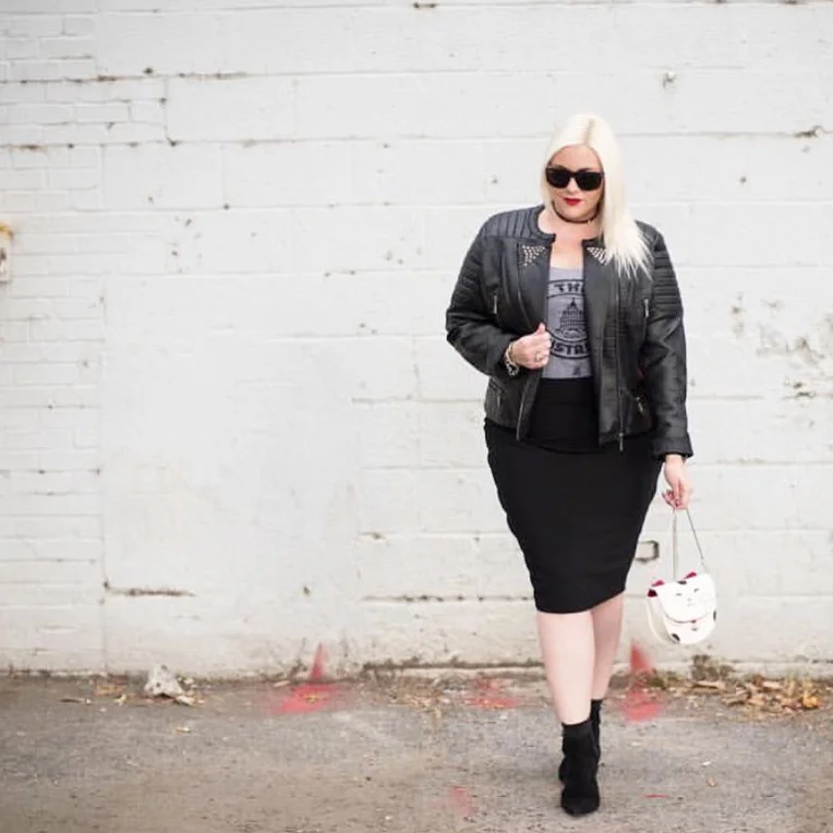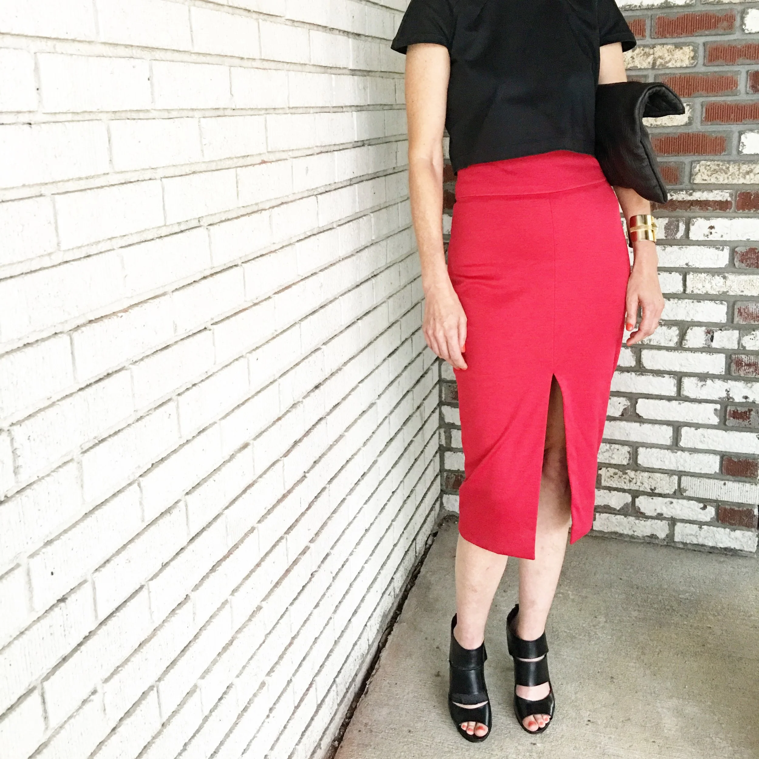 “After a couple of fittings, I am so happy with the fabric I chose and the fit we achieved. I went with a faux leather because it is a little edgy, and goes with everything. The skirt hugs all my curves perfectly. It is incredible how wearing something that fits YOU and was made especially for YOU can truly make one feel confident and sexy”